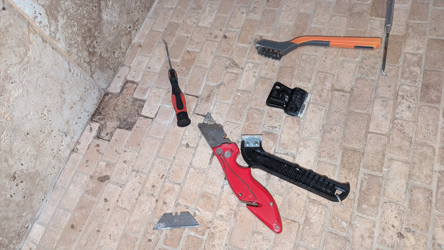 I start with a deep cleaning w/ lots of scrubbing and a pressure washing then I start poking around and digging out failed grout and loose tiles.