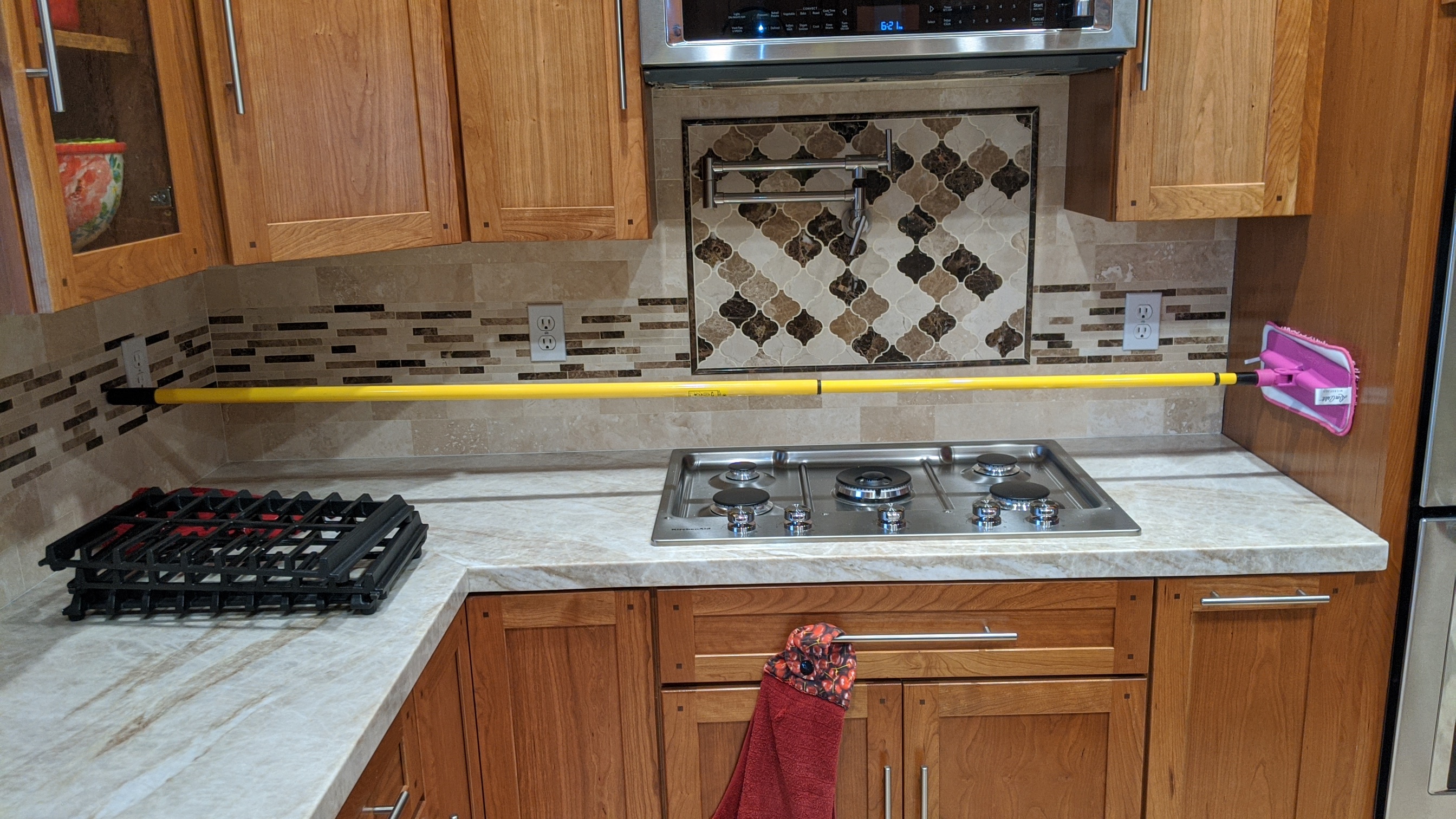 This Travertine install was a botch job in almost every way but when the wood floor installer knocked his sander into the filled tile, this was his "I also work with natural stone type fix...