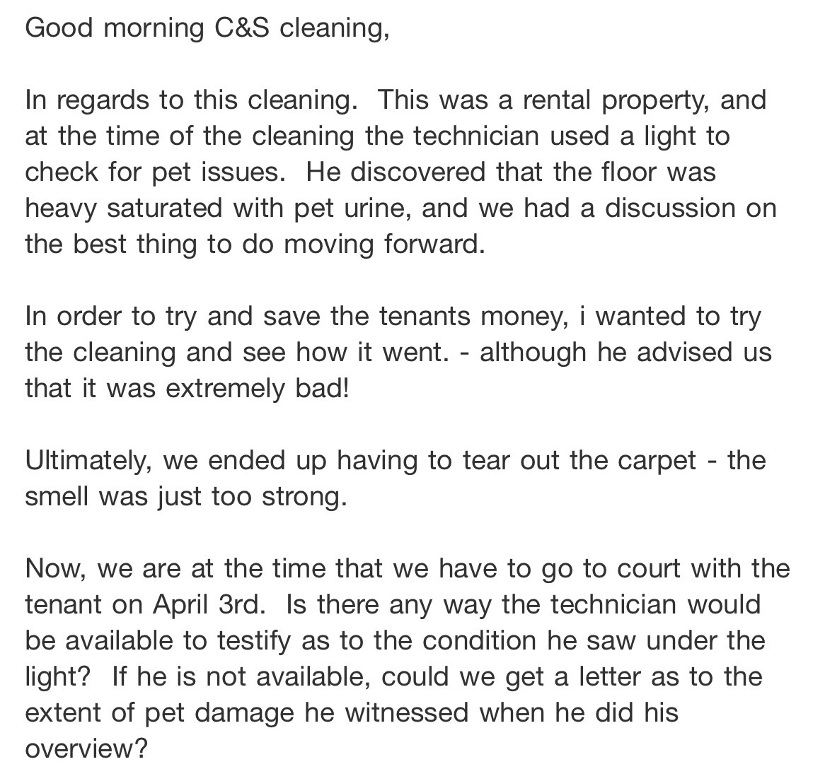 On mm/dd/yyyy we were called out to clean a property at 123 Main St, Anywhere, PA 12345. On arrival our technician used a black light prior to inspect the carpet prior to cleaning. There was a distinct urine odor and the light is used to identify the extent of the damage as carpet will glow in the presence of urine. There were extensive areas of contamination and the owner was advised that cleaning would not be able to remove the urine to a satisfactory level. Based on our technician's experience, the urine odor and the amount of stains he felt it was best not to clean. The landlord felt that it was at least worth the effort to try. We gave it our best effort, but the stains were too extensive.