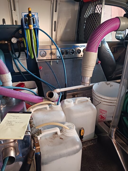 Ive found the old steamgeni pto's the easiest. You can see and reach every component virtually nothing is proprietary and you can completely tear down one with a screwdriver and a crescent wrench. There's a clutch on the engine, 2 bearings in the driveshaft, 3 belts on the machine a pressure pump (eighter hydra cell or hypro) a vacuum eighter a 45 or 47 small water box, heat exchanger and a simple solenoid for throttle. Chemical supplied by starvation. They generally last over 20 years and can easily out live the van below is a picture of my spare used it last week van is a 2000 3500 and has 201k on it and the machine is about to turn 11k hours. In 2018 i went to the Las Vegas trade show thinking i would replace it but the idea of replacing a perfectly good 19 year old machine with one with a life expectancy just slightly longer than the payment plan didn't set well with me. I went home took a 1998 steamgeni geni pto upgraded it slightly and installed it in a 2020 van. For about 10k less than the pos at the trade show and have soooo much more machine but thats me. My advice to someone buying a machine the acronym KISS comes to mind keep it simple stupid! And the simplest is probably the most reliableista