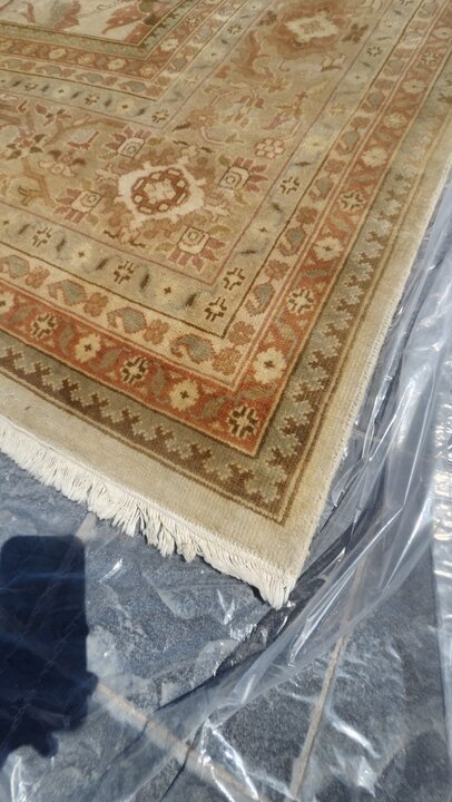Incredible home first of all, this was one of three rugs they gave after we completed the 12 hour long cleaning today, 2 vans 3 workers. I don't want to give to much info but I though 8k square feet was large, this was 10k square foot plus home. I thought I might put this rug to use but it is massive, about 14ft x 22ft. Rug is wool and handmade is all the information I have based on the price tags/information on the "smaller rugs", not a sticker but a post card type information sheet attached on a yarn noting quality, material, and information about those ones.