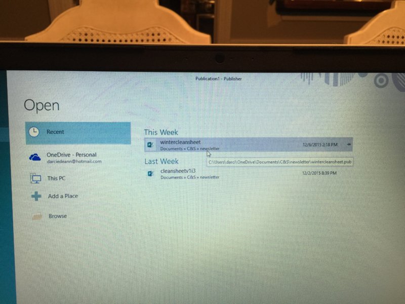 There is absolutely nothing left in the C:/Users/Darci path, and everything appeared to be where I wanted it. And then last night I went to open the newsletter and it was gone. Publisher showed the above photo in recent. And two of my folders in the scrapbooking folder are gone. Nowhere.