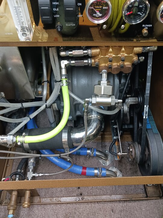 Design, for instance drive shaft, straight with inner and outer only 2 bearings easily rebuild no ujoints. Belts are adjusted with camed idler pulleys 2 cresent wrenches 1 bolt from start to finish less than 5 minutes ( including removing and installing covers)Wastetank/ solid stainless steel. Standard steamgeni uses starvation for chemical feed,no chemical pump and related parts (lines,valves,check valve etc.) Instead of a throttle controller steamgeni uses a somple solenoid( but only has high&idle). Acess front and top covers remove for complete access to all components. Its not that things don't wear out and need repairs. Its that everything is open and easily accessible. All machine components control panel, everything is in 1- 3'×3' box behind the drivers seat also when things need repaired or replaced, you can do it without standing on your head the difference between working on a steamgeni and working on yours is like the difference between changing spark plugs on a car built in the 70s vs. finding and changing plugs on one built today plus the added longevity of stainless construction. In short they are built to be repaired not replaced. Keep in mind when showing pictures of frankinstien ive added chemical pump, salsa heat, dual chemical tank valve dual wastepump float switches,throttle controller/ remote start/stop on machine and on the pressure pump. Blower Tachometer etc etc In short theres a lot more shit in the 3×3 box than a stock steamgeni, and still you can see and acess all components easily. I have a near stock one as a spare. Maybe this weekend if i have time ill pull the covers off and take some pics and put um side by side woth frankinstien. To show how much more simpler the stock ones are