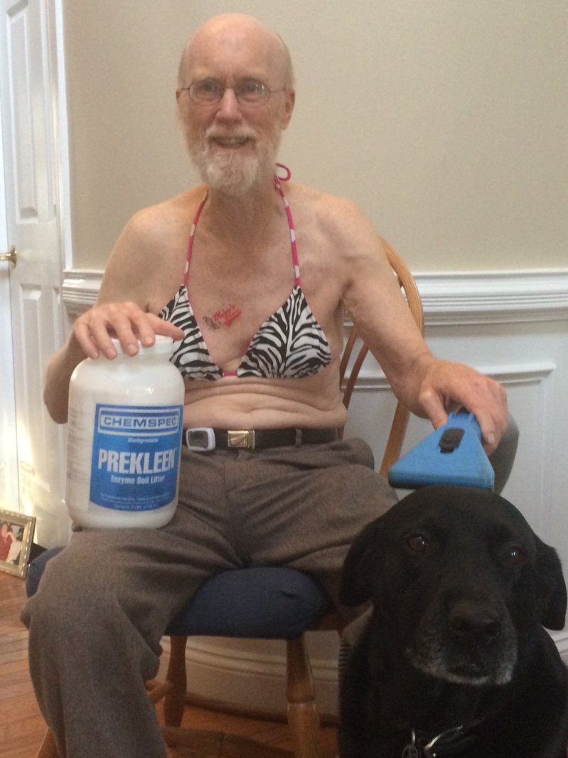 I can not unsee thisGrandpa...wearing a bikini, sporting a cleavage MB tattoo, using the sapphire upholstery tool on Lucia the black lab, while holding Prekleen.