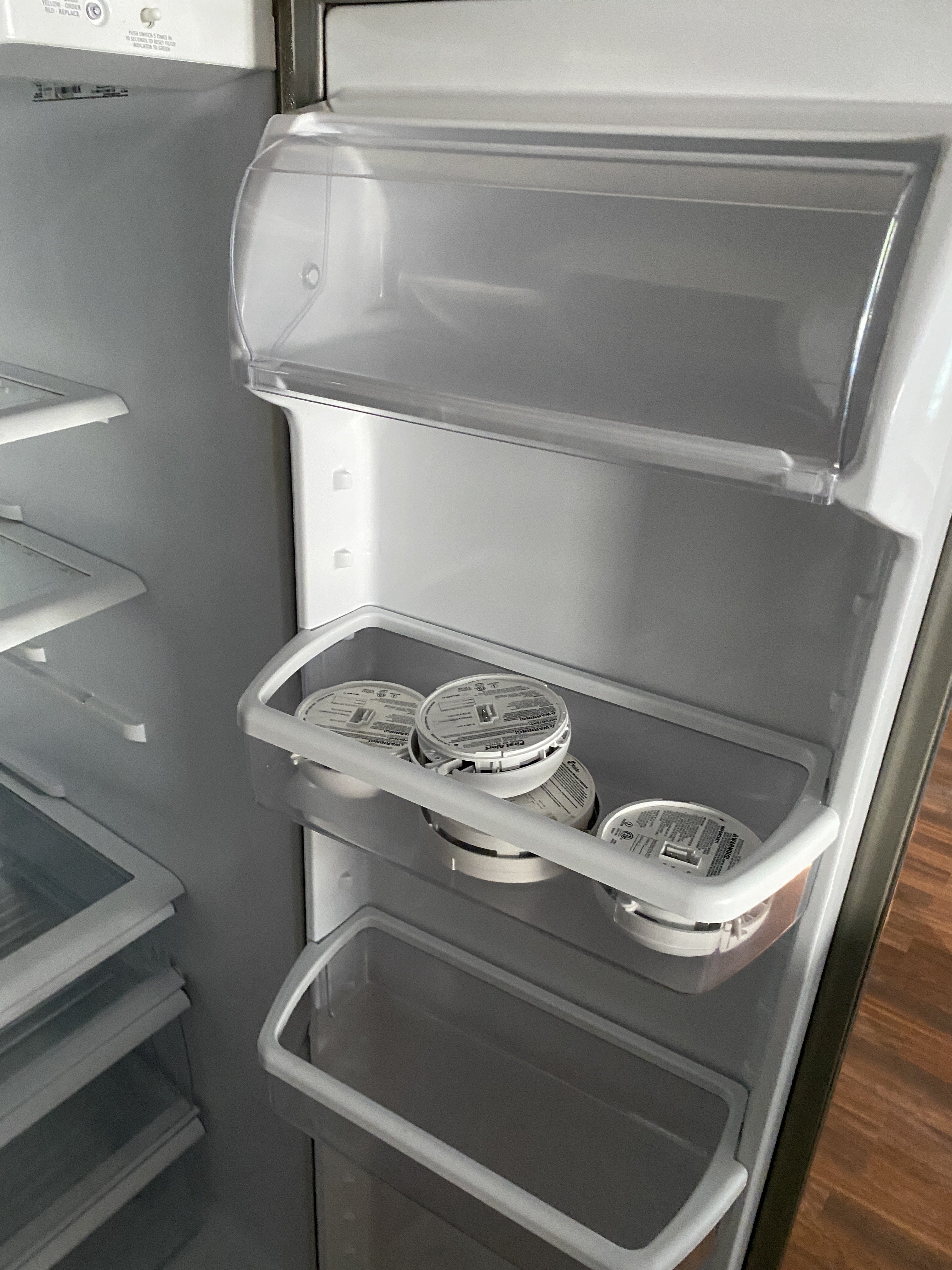 Empty rental house. Painters sprayed the ceiling without removing smoke alarms. Damn things will not reset. I’m not rescheduling this job. Called the PM and told them the problem. Then I took down the alarms and put them in the fridge to deaden the noise. They are still beeping. 😵‍💫