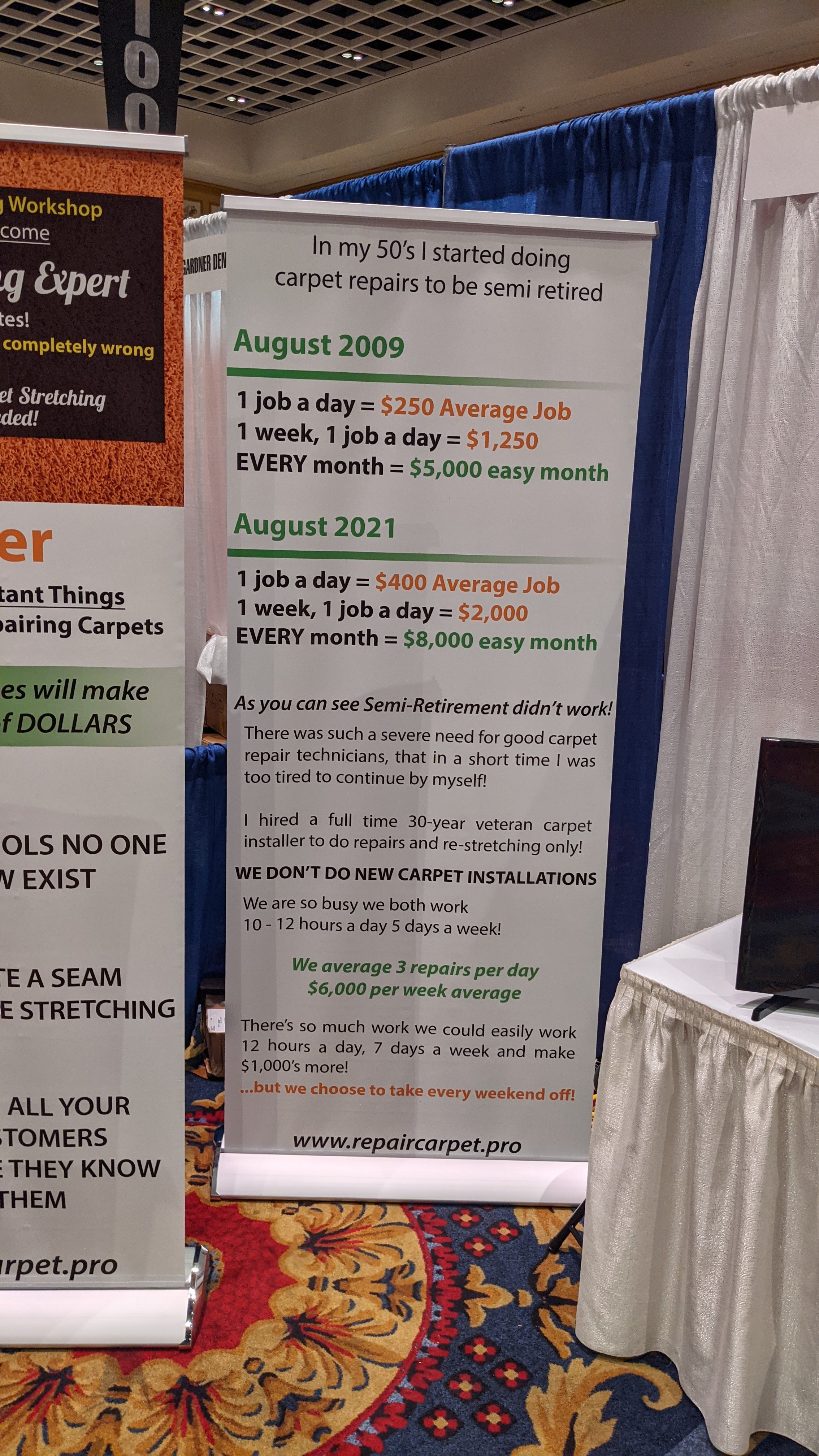 Great money in stretching and repairs, and it's very profitable considering the low investment in equipment.Man, I must be getting jaded. I see these pics and nothing excites me anymore. I see pics of a happy guy bragging about making killer money doing repairs, and I just think to myself, I hate working on my knees and digging out my stretcher from my van. I was even bitchy today cleaning upholstery. Every job I had this week included couches and recliners. Doing so much upholstery makes me crabby. I just want to clean carpet.
