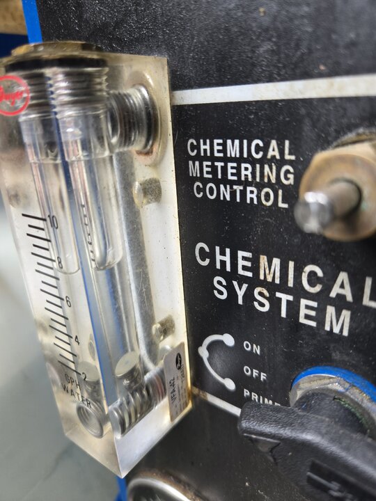 If you have a chemical pump your chemical meter probably has brass fittings and depending on the chemicals you use they tend to deteriorate quite rapidly. The dwyer meters used on machines that use starvation to supply chemicals are all stainless. The way I found this out was all my business life ive had machines that used starvation to feed chemicals. (They have a flow adjustment knob at the bottom of the meter) when i retro fitted frankinstien with a chemical pump i bought the proper dwyer meter and it lasted only 900 hours before giving me problems. The way that i solved it was to take fittings from a pile of old meters that were all stainless and swap out the parts. I have a bunch of um if you'd like to do the same to your meter. I don't have any extra â…›pipe to hose fittings to connect it up but their easy to find on ebay Amazon etc.etc.